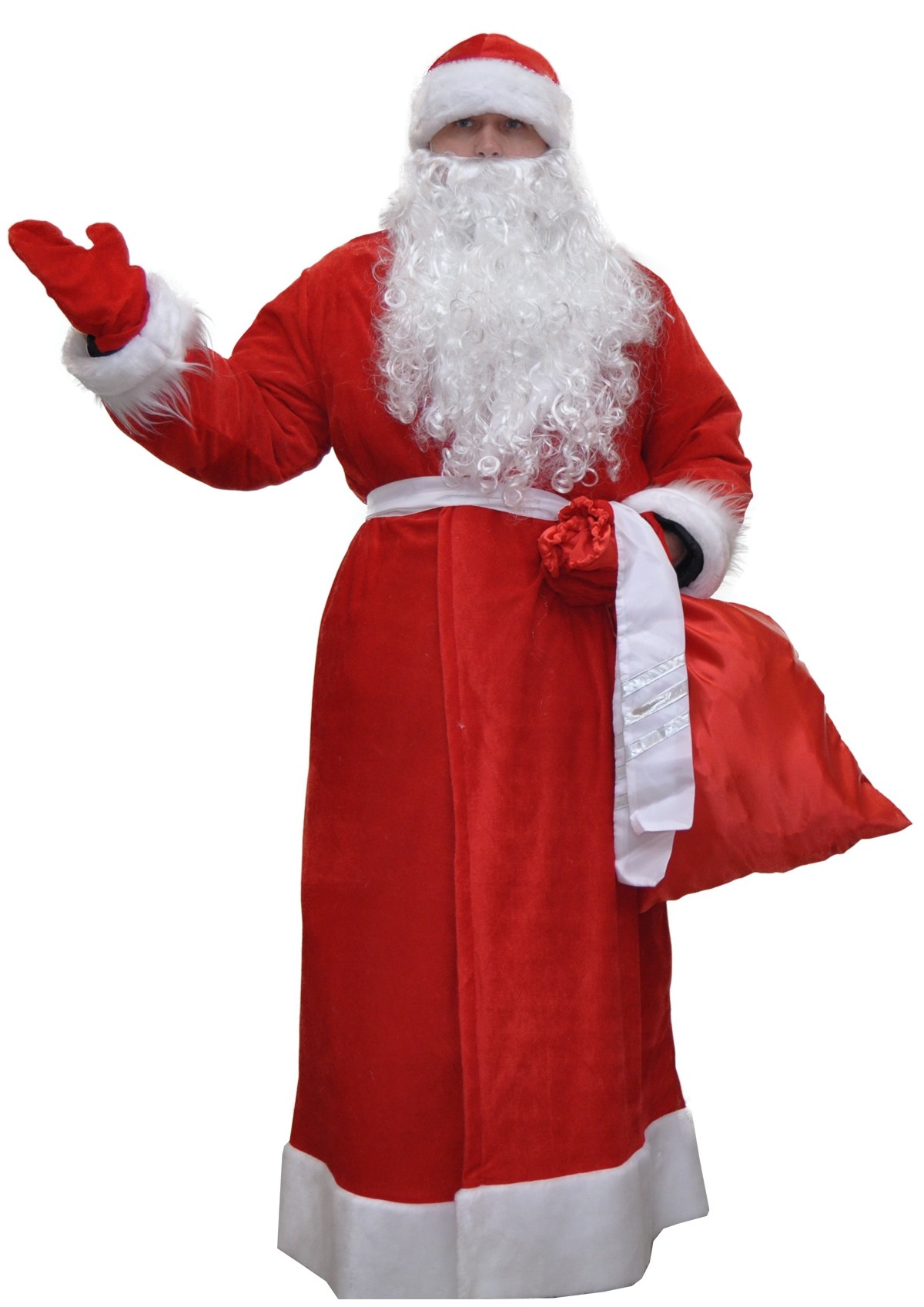 Велюровый костюм Дед Мороза подойдет для постановки спектаклей, выступления на детских утренниках и подобных мероприятиях. Костюм выполнен из велюрового материала с белой меховой отделкой. В комплект входит длинный халат c поясом, шапка с белым меховым отворотом, длинная густая борода, красный мешок для подарков и рукавицы.