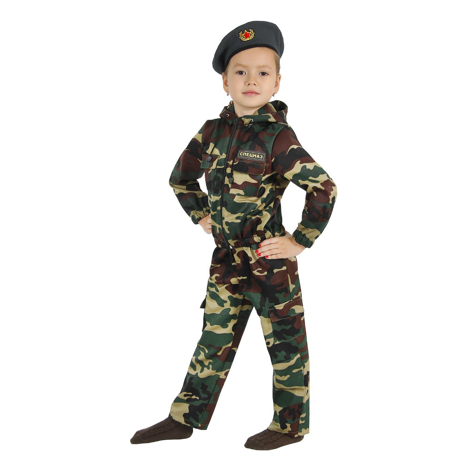 Детский костюм Спецназ отлично подойдет для тематических праздников и выступлений. Костюм выполнен в камуфляжной расцветке и включает в себя куртку на молнии с капюшоном, брюки с накладными карманами и берет со значком.