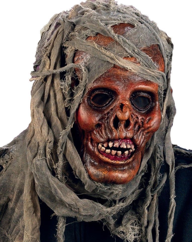 Маска мумии выполнена в красновато-коричневых тонах. Кривые зубы, впалый нос и глаза - эти штрихи добавляют маске жуткий вид. На маске имеются старые рваные бинты, в которые когда-то эта мумия была аккуратно завёрнута.