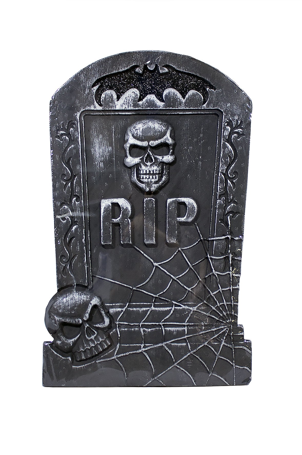 Надгробие с летучей мышью - отличная декорация на Хэллоуин. Надгробие выполнено из пенопласта, покрытого серой краской. Надгробие с черепами, силуэтом летучей мыши и надписью RIP. Нижняя часть дополнена паутиной.
