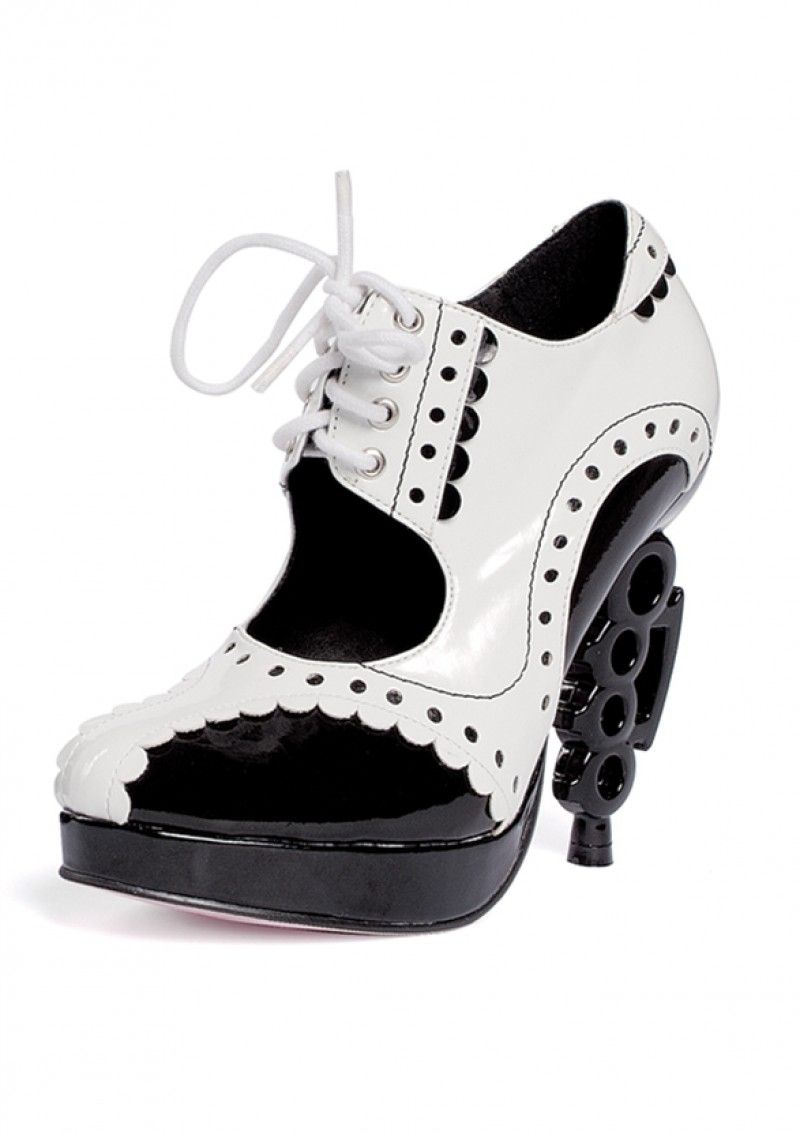 Туфли мафиози - это черно белые туфли со шнурком и необычным рельефным каблуком 10 см. Также у туфлей есть небольшая платформа. Такие туфли прекрасно подойдут для костюмов гангстерш и мафиози.