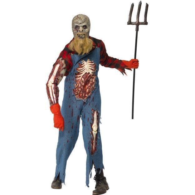Костюм зомби колхозника включает в себя синий рваный комбинезон с принтом открытой грудной клетки, его дополняют красные перчатки и латексные рукава, которые имитируют открытые раны. Костюм завершает латексная маска с бородой.