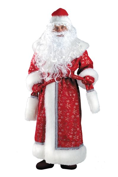 В комплект карнавального костюма Деда Мороза из плюша входят шуба, шапка и борода, парик, пояс а также варежки и мешок.