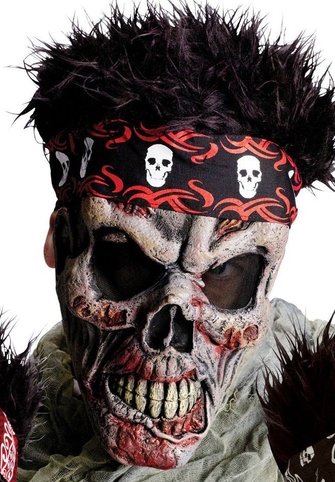 Маска зомби с плюшевыми волосами - это латексная маска, которая представляет собой лицо почти сгнившего зомби с пожелтевшими зубами, чёрной банданой с изображением черепов и чёрными плюшевыми волосами. Эта маска идеально подойдёт для вечеринок в честь Хэллоуина.