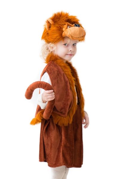Костюм обезьянки для девочек выполнен в темно-коричневом цвете из мягкого материала. В комплект костюма обезьянки входит юбочка с длинным хвостиком, жилетка без застежек с меховой отделкой, а также пушистая шапочка-маска.