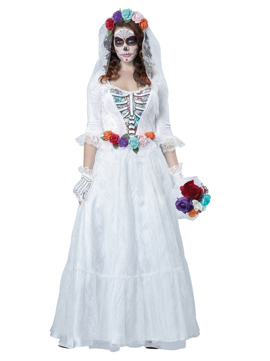 Костюм умершей невесты выполнен в стиле нарядов в честь мексиканского праздника День мертвых. Костюм включает в себя длинное белое платье с кружевной отделкой и рисунком на груди в виде ребер, фату, перчатки с рисунком в виде костей, 11 разноцветных роз на булавках и набор для нанесения грима.