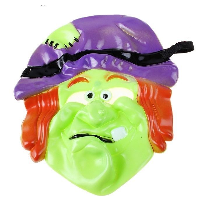 Маска ведьмы зеленого цвета с рыжими волосами и фиолетовым головным убором с заплаткой поможет создать шуточный образ злобной старухи и повеселит гостей вечеринки. Маска сделана из пластика и имеет размер 20х24 см.