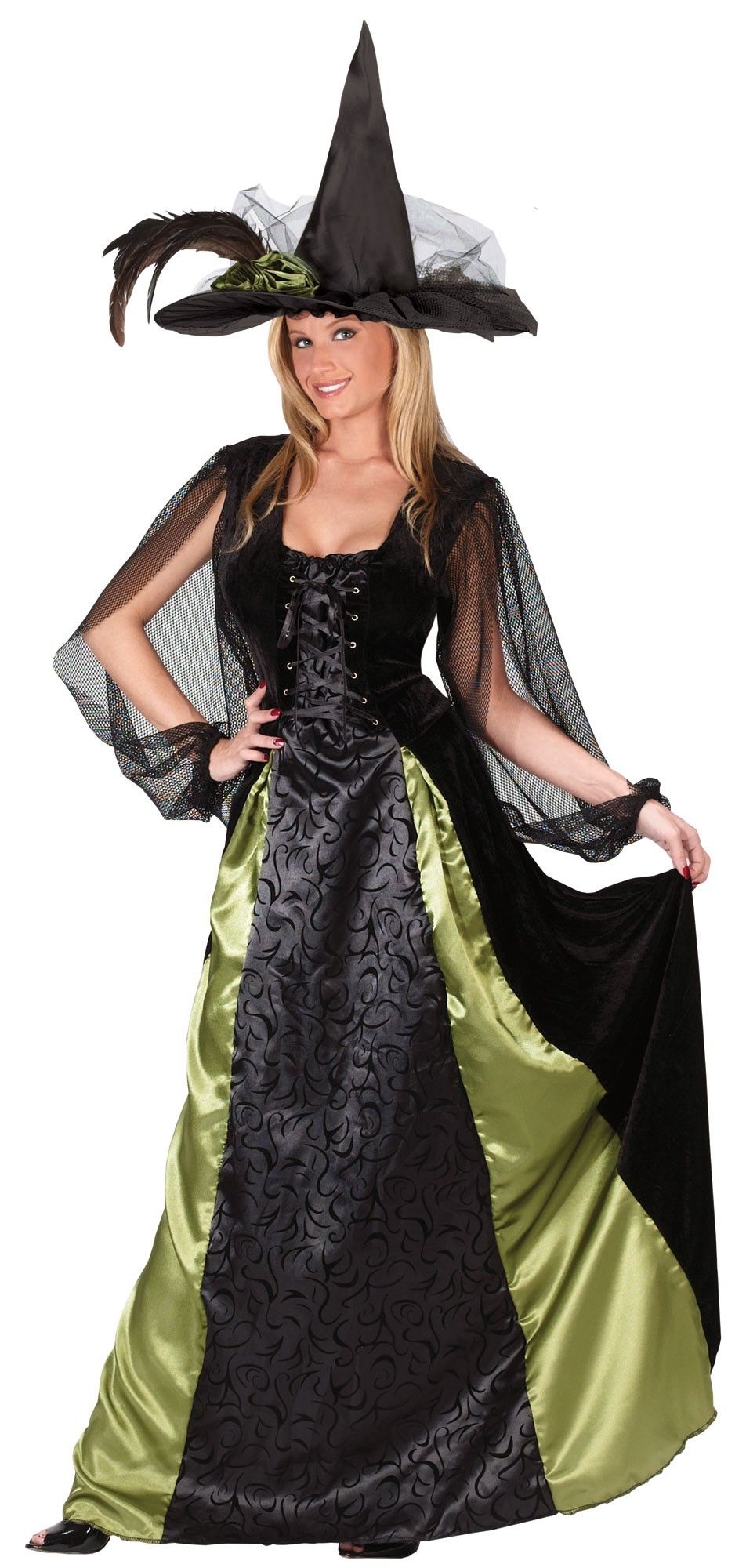 Карнавальный костюм Готической Ведьмочки включает в себя длинное шикарное платье со слегка расклешенной юбкой, на которой имеются оливковые вставки, а также черная вставка с узорами. Топ выполнен из бархатного материала и имеет атласную тонкую шнуровку. Рукав из сетчатого материала с разрезами. К платью прилагается высокая конусная шляпа с полями, украшенная пером и сетчатым материалом.