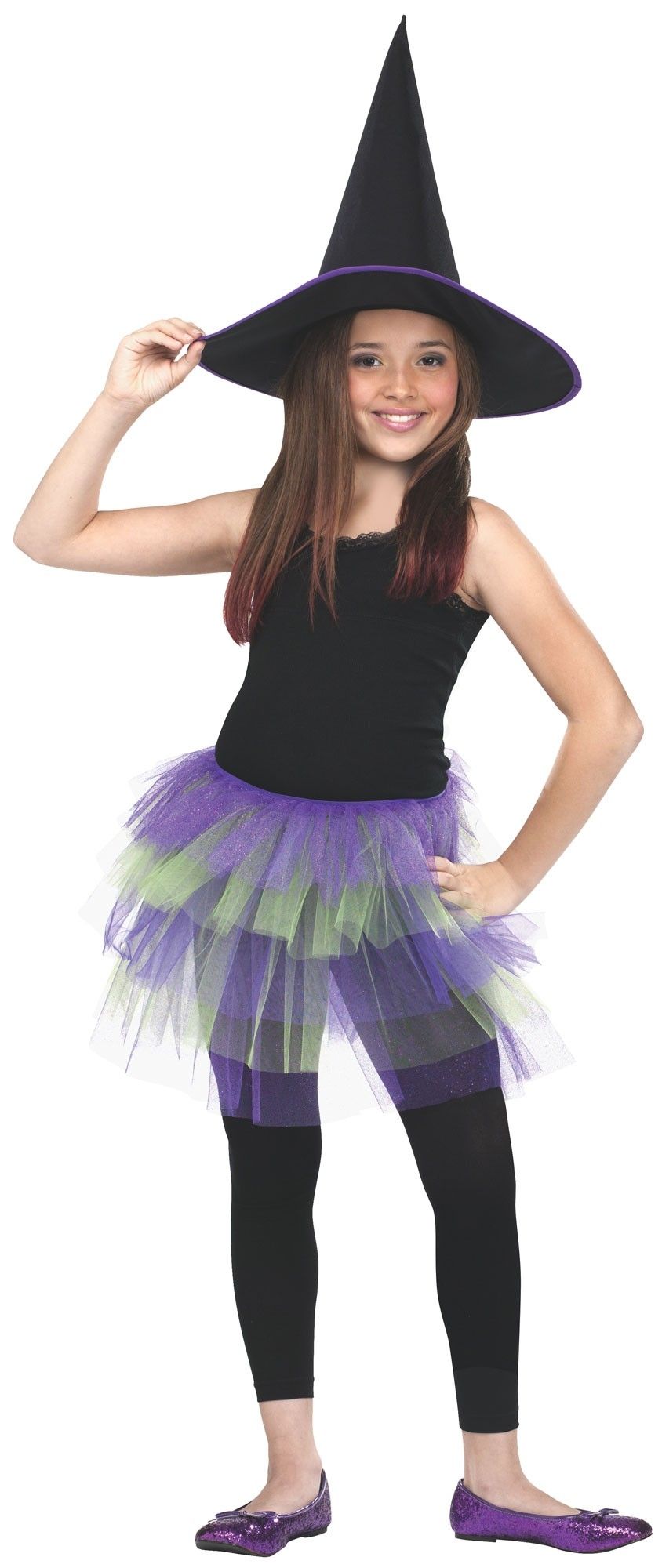 Детская юбочка Туту фиолетовая идеальное дополнение к костюму ведьмочки, пример которого можно увидеть на фото. Юбочка состоит из пяти слоев сетчатого материала. Она выполнена в фиолетовом и зеленом цветах.