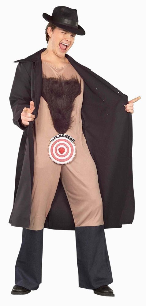 Костюм наглого флешера включает в себя боди телесного цвета, к которому прикреплена мишень, закрывающая интимное место и искусственный мех на груди, плащ, который закрывает это тело и шляпу. Этот экстравагантный костюм подойдет для тематических вечеринок и маскарадов.