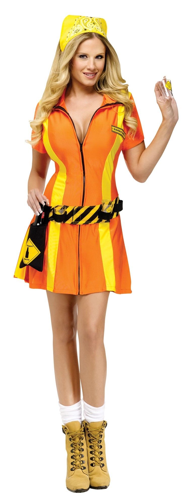 Костюм горячей дорожнорабочей включает в себя оранжевое платье на молнии. Платье украшено вставками из желтых полосок. К нему прилагается желтая бандана, черный пояс с кармашком для бутылки и трех рюмок. Рюмки также входят в комплект.