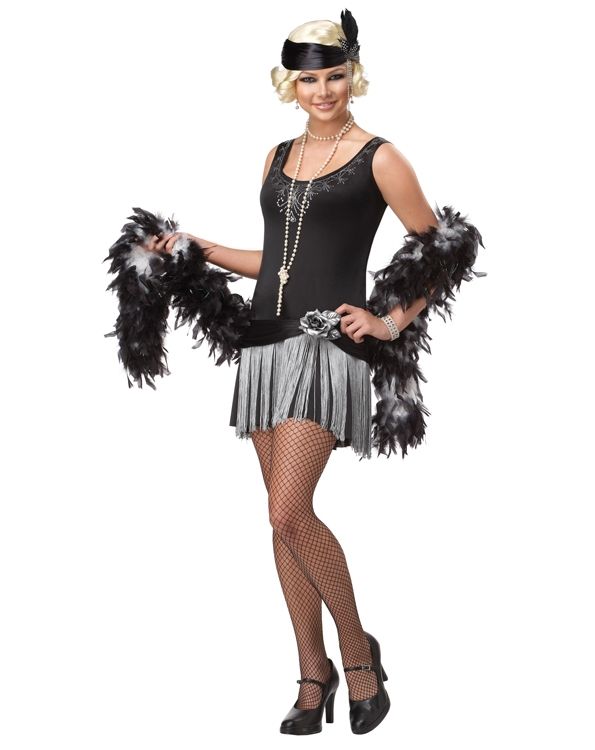 Подростковый костюм светской ретро-леди идеален для ретро-вечеринок, на которой вы будете одной из самых изящных дам. Костюм состоит из черного короткого платье, подол которого украшен серым бисером и цветком, а также из головного черного убора с пером.