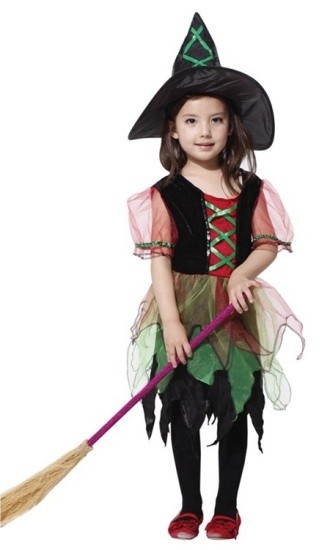 Детский костюм обаятельной ведьмочки станет отличным нарядом для празднования Хэллоуина и других тематических праздников. Костюм включает в себя платье с многослойной ассиметричной юбочкой и полупрозрачными короткими рукавами. Также в комплекте классическая конусовидная шляпа, украшенная зеленой ленточкой.