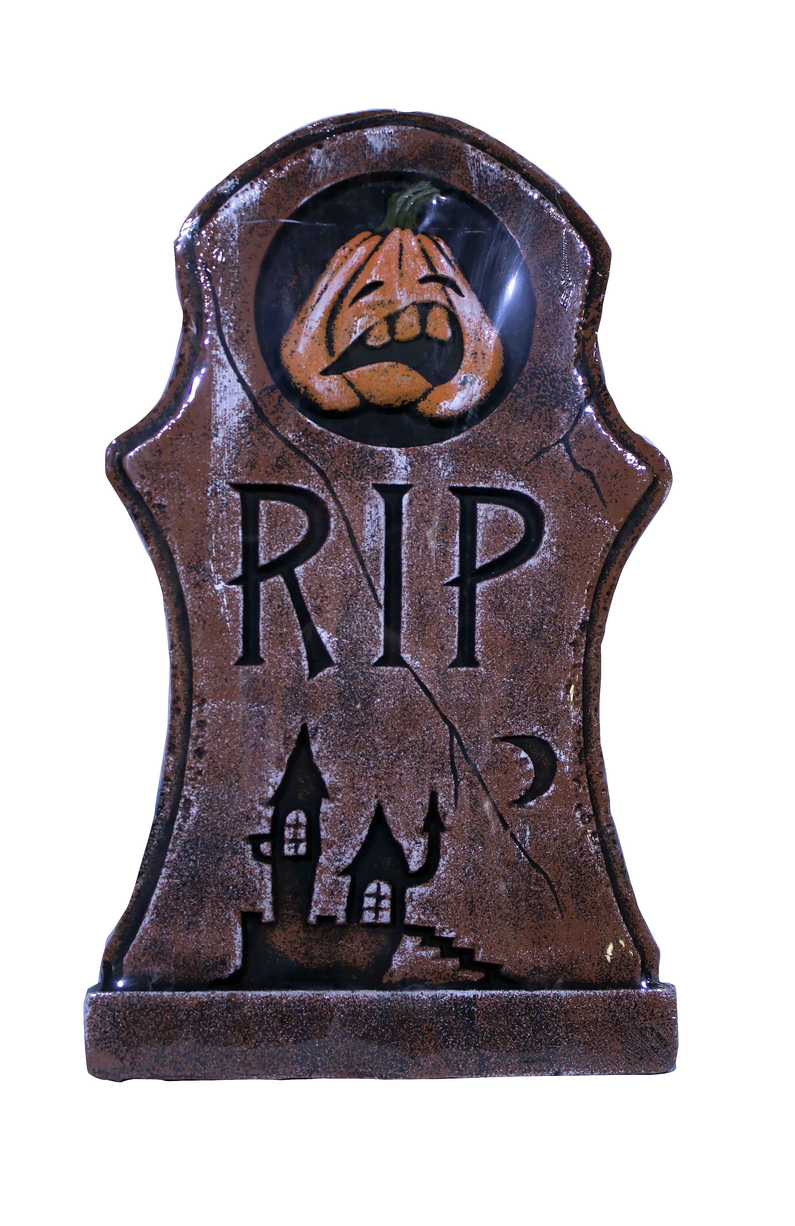 Надгробие с тыквой - темно-оранжевое надгробие, выполненное из пенопласта. Может стать отличной декорацией на Хэллоуин. Надгробие украшает изображение тыквы с мордочкой, также его дополняет надпись RIP и силуэт дома.