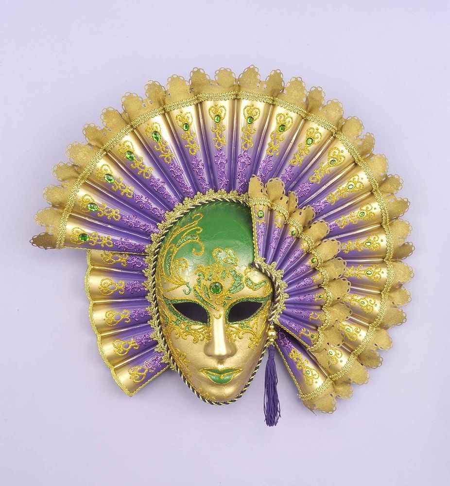 Венецианская маска с веерами выполнена в золотом цвете. На маске имеются зеленые вставки с узорами из золотых блесток. Сверху маску украшают раскрытые веера фиолетово-золотого цвета.