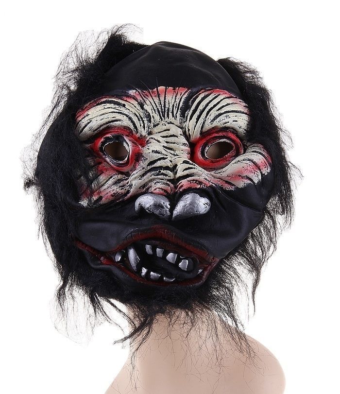 Маска причудливой обезьяны с черными волосами и изуродованным лицом. Маска полностью скрывает лицо, изготовлена из латекса и имеет размер 2х20х30 см.