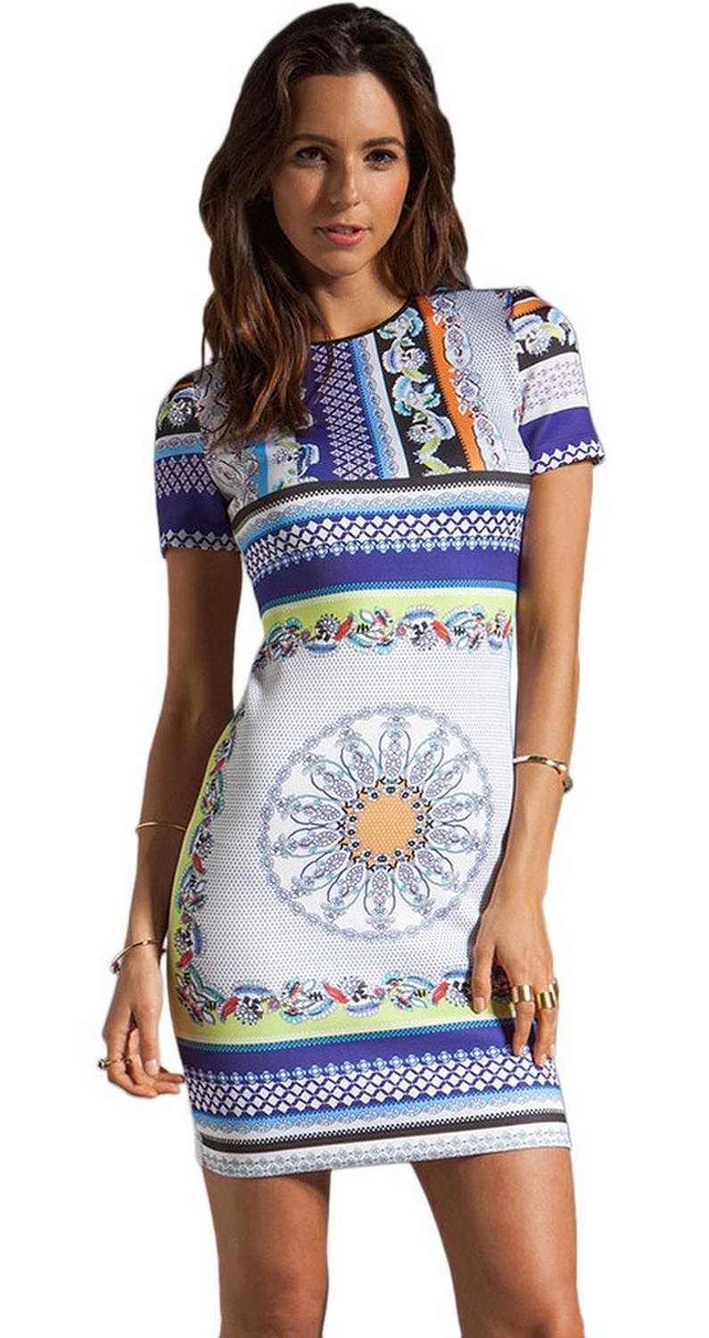 Платье Gandhi Scarf выполнено из эластичного материала, приятно прилегающего к телу. Короткое слегка обтягивающее платье с коротким рукавом с цветными геометрическими принтами. Платье выполнено в бело-синих оттенках.