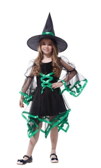 Детский костюм ведьмочки зеленый - очаровательный костюм для настоящей чародейки. Костюм включает в себя черное платье с длинными полупрозрачными рукавами и классическую конусовидную ведьминскую шляпу. Платье декорировано шнуровкой и окантовкой зеленого цвета.