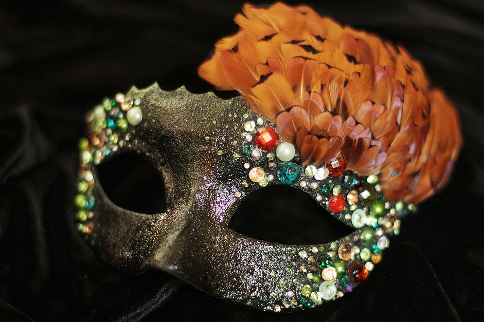 Карнавальная маска Величественная - черная блестящая маска на глаза, которая отлично подойдет для карнавалов и маскарадов. Маску украшает композиция из 120 перьев коричневого бронзового цвета, а также разноцветные стразы различного размера.