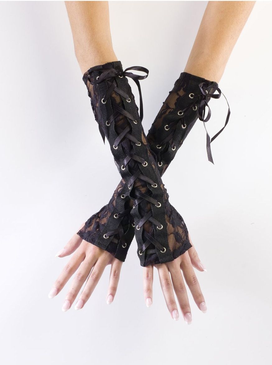 Готические кружевные перчатки - прекрасное дополнение к готическим костюмам, чёрным кружевным платьям и подобным нарядам. Перчатки выполнены в чёрном цвете из кружева, сверху имеется шнуровка из атласной чёрной ленточки.
