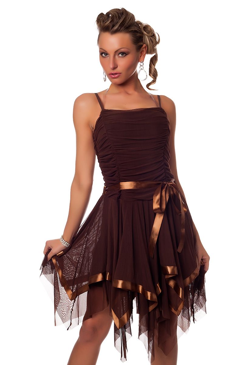 Коричневое легкое платье - это вечернее платье выполненное из легкого шифона. Платье на тонких бретельках с расклешенной многослойной юбкой. Верхняя часть украшена аккуратными сборочками, на поясе красивая атласная ленточка с бантиком, по непрозрачному края подола проходит коричневая атласная ленточка.