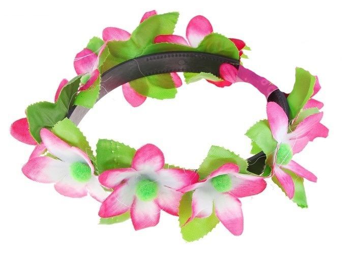 Ободок гавайский с цветами и зелеными листочками. Размер ободка 3х17х15 см.