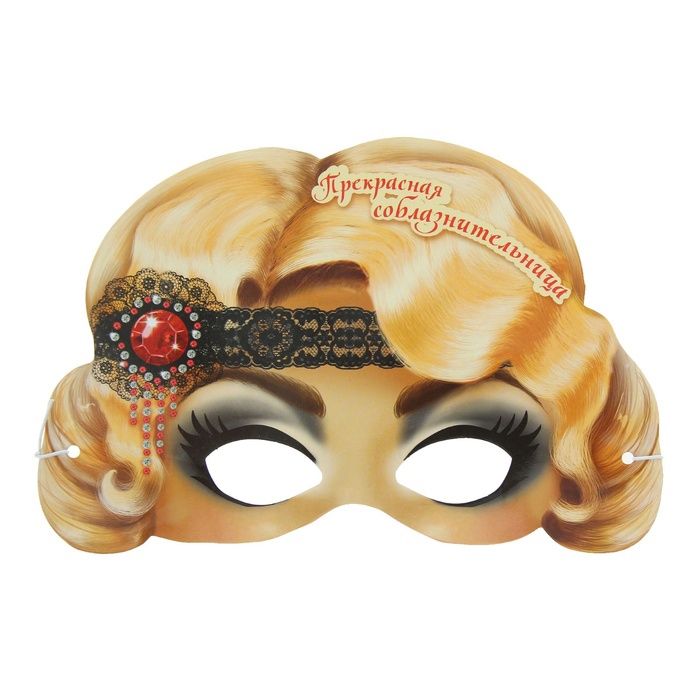 Маска прекрасной блондинки-соблазнительницы - это маска на пол лица, изображающая лицо очаровательной блондинки с ярким выразительным макияжем и прической в стиле ретро. Маска выполнена из качественного картона и имеет прорези для глаз и удобную резинку для крепления.