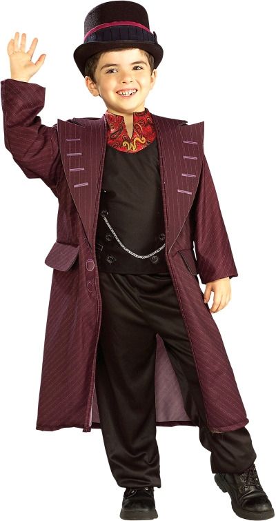 Детский костюм Вилли Вонка - главного героя фильма и сказки про Шоколадную фабрику. Костюм включает в себя длинный плащ бордового цвета с прикрепленным жилетом, а также невысокий черный цилиндр с красной полоской.