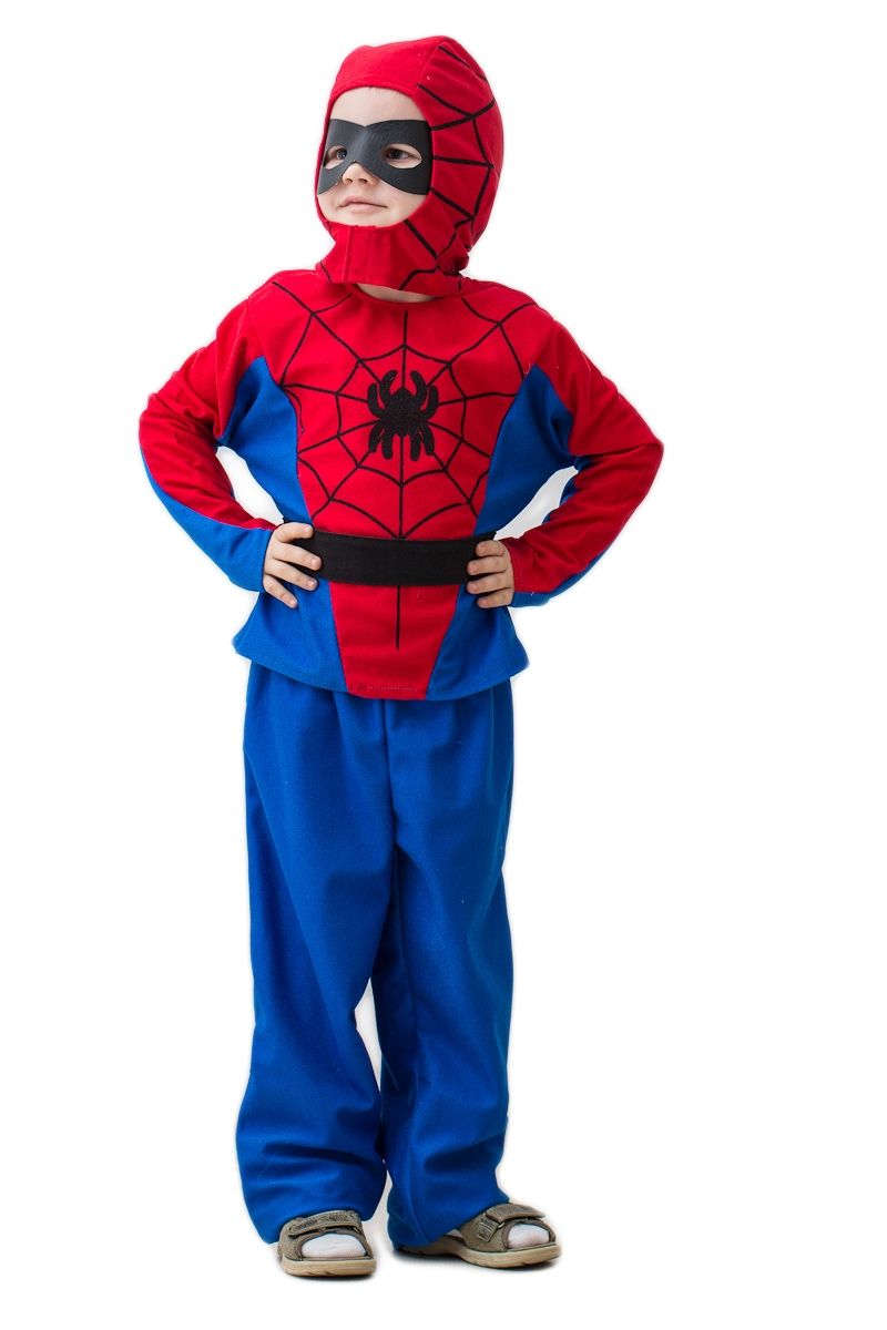 Детский костюм всеми любимого героя Человека Паука. В комплекте синие штаны, кофта с длинными рукавами с узорами паутинки и пауком, черный пояс и черная маска, а также красная шапка на липучке.