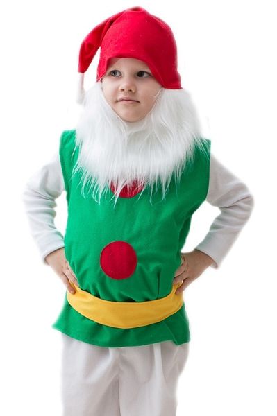 Детский костюм Бородатого гномика - это яркий костюм для детей, который подойдет для различных утренников и постановки спектаклей. В комплект костюма входит яркий красный колпак, зеленая безрукавка, желтый пояс, набивной живот и белая мягкая борода.