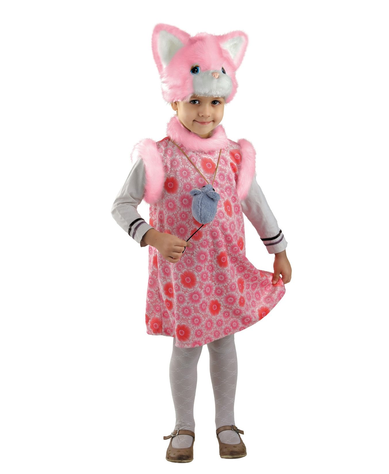 В комплект костюма розовой кошечки входит плюшевая маска, сарафанчик и подвеска в виде мышки.