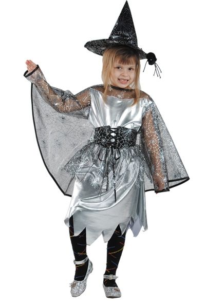 Детский костюм Паутинной Ведьмочки включает в себя серое платье с полупрозрачными рукавами и прикреплённым плащом, пояс и конусную шляпку. В этом костюме ваша девочка будет как настоящая ведьмочка, которая любит приключения.