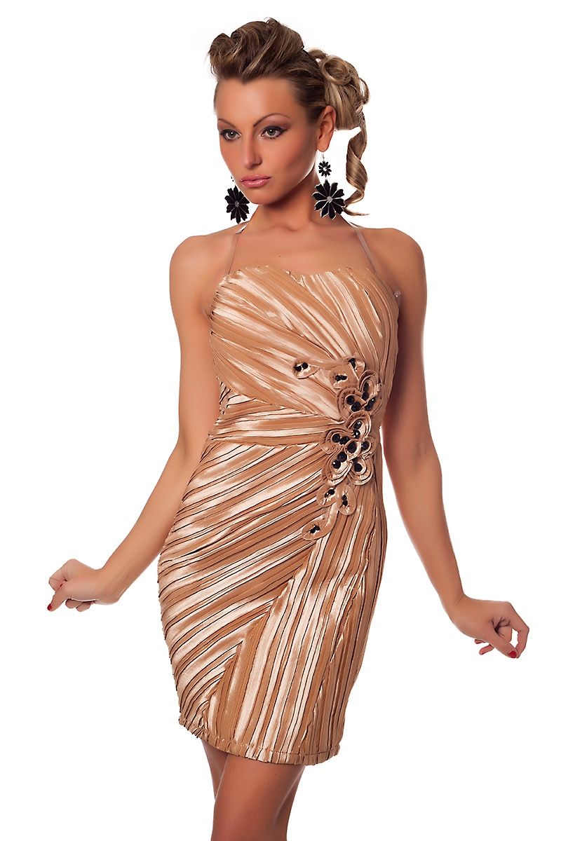 Изящное светло-коричневое платье - это платье с мелкой гофрой, которая расположена в различных направлениях. Платье украшают светло-коричневые цветочки с черными вставочками. Платье не имеет лямок, но хорошо держится на теле. Сзади имеется молния. Часть спины и плечи соблазнительно открыты.