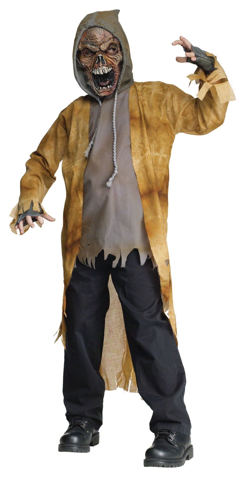 Детский костюм уличного зомби включает в себя рваную кофту с длинным плащом с капюшоном, жуткую маску со множеством морщин, а также перчатки без пальцев.
