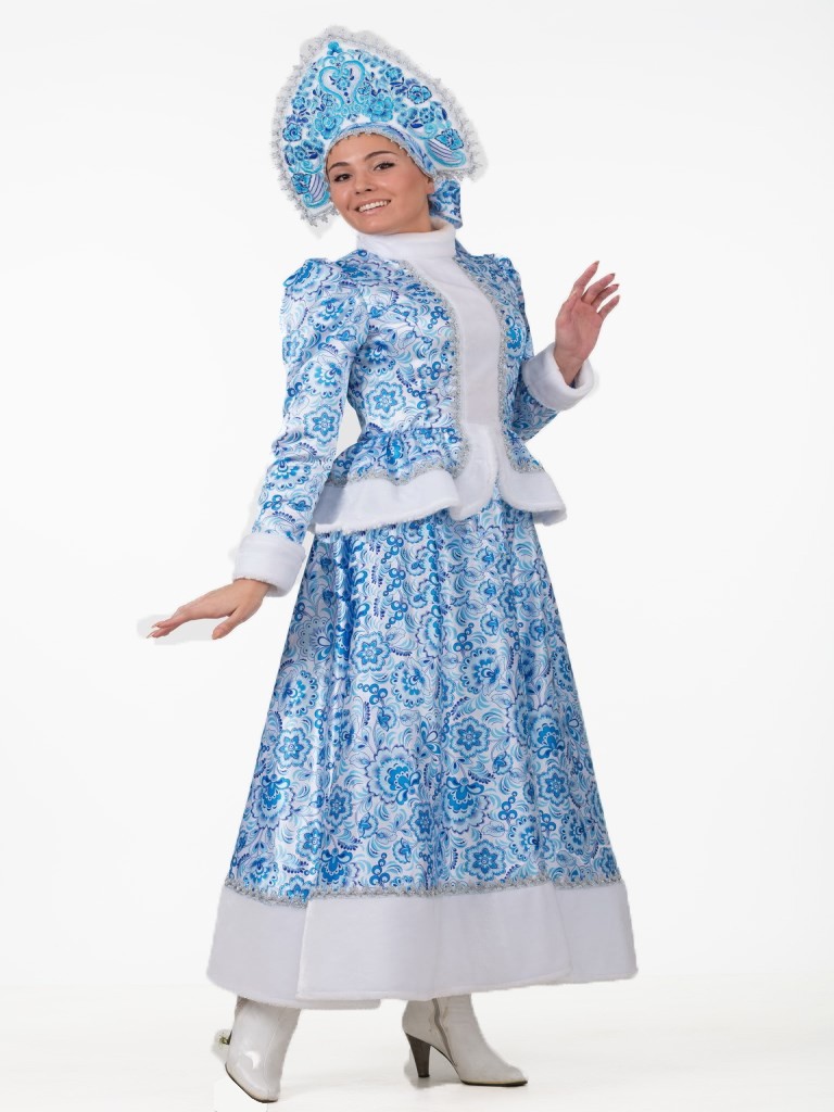 Костюм Снегурочки Гжель для взрослых включает в себя юбку в пол с белым меховым подолом, приталенный кафтан с меховой баской и серебряной тесьмой, а также кокошник с голубым узором гжель. Костюм выполнен в стиле гжель - в белом цвете с голубыми узорами.