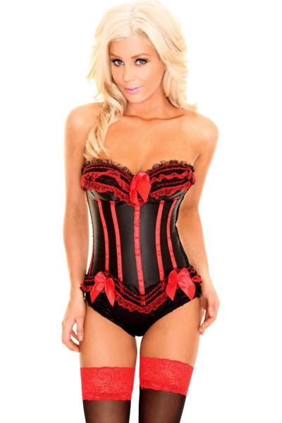 Шикарный черный корсет на косточках с изысканной красной отделкой и трусиками в комплекте.