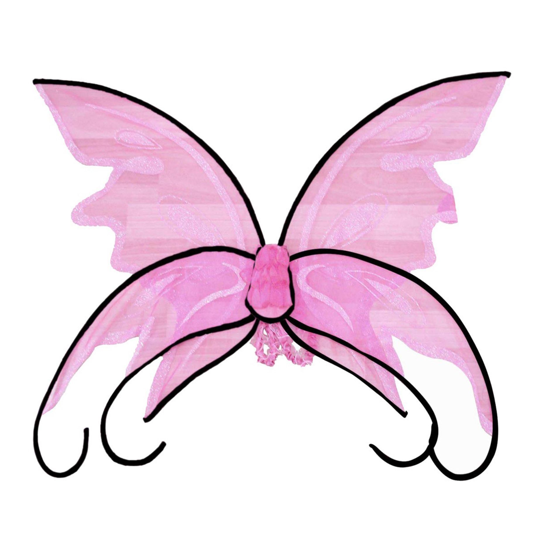 Розовые крылья бабочки представляют собой легкий розовый материал с узорами из блесток, который сочетается вместе с черным тонким каркасом с закругленными кончиками. С помощью таких крыльев можно получить легкий и нежный образ бабочки.
