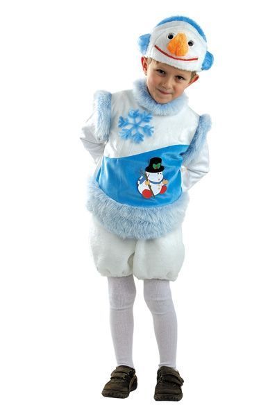 Детский костюм Снеговичка включает в себя бело-голубую безрукавку, отделанную мехом и украшенную снежинкой и снеговиком, белые шортики и головной убор в виде лица снеговика с морковкой. Такой костюм идеально подойдёт для Новогодних праздников. В нём ваш малыш будет выглядеть как настоящий снежный снеговик.