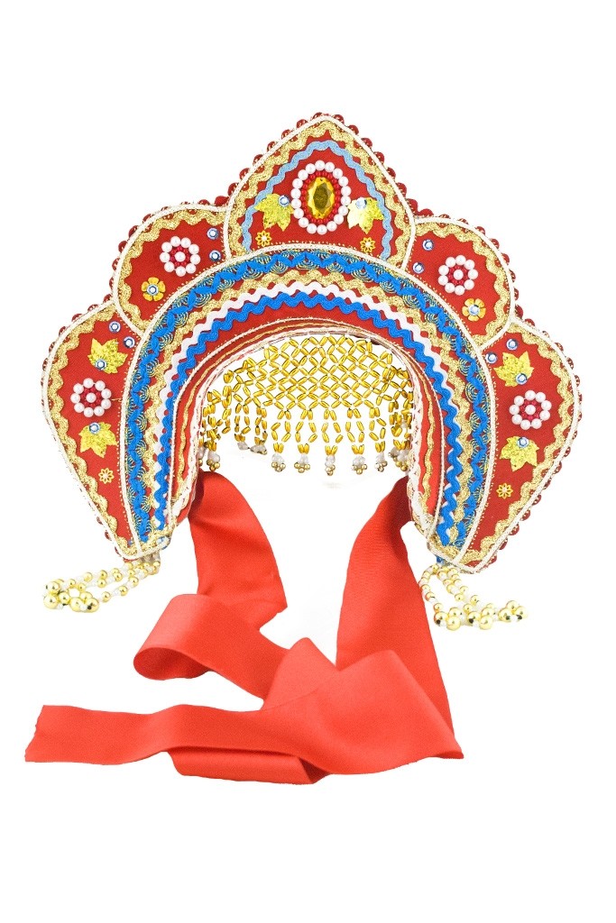 Кокошник Фантазия красно-золотой - яркий атласный кокошник красного цвета, который украшен узорами из золотистой тесьмы и бусинок.