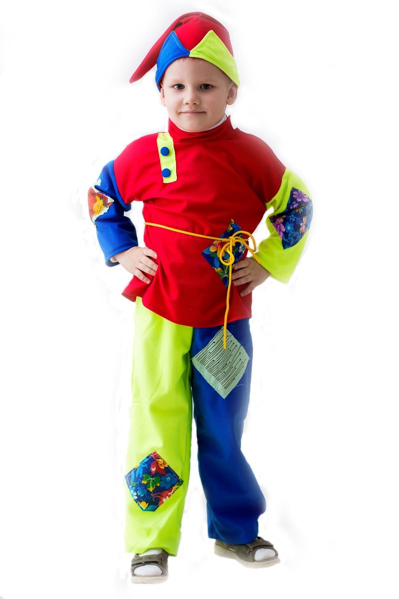 Разноцветный детский костюм Скомороха выполнен в ярких различных цветах. Подойдет для веселых праздников. В комплекте костюма красная рубаха с разноцветными рукавами, разноцветные штаны, тонкий пояс-шнурок, а также разноцветный колпак.