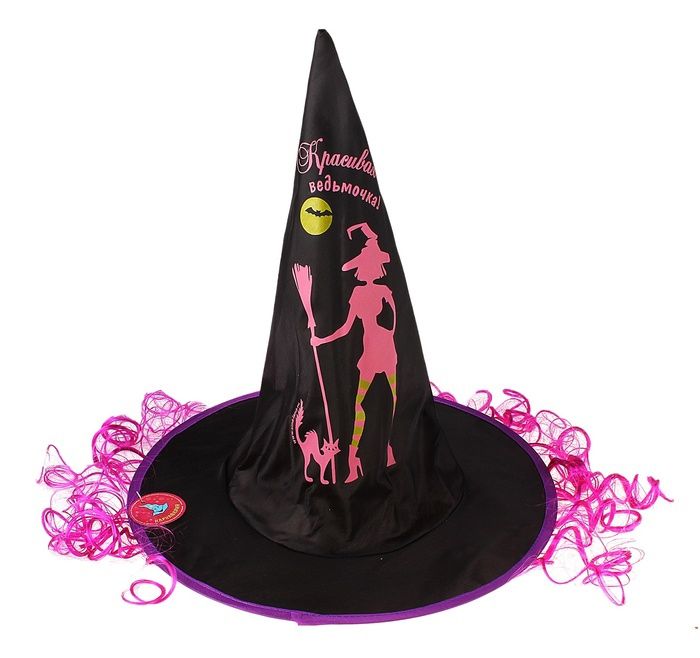Шляпа ведьмы с фиолетовыми локонами - это высокая конусовидная шляпа черного цвета с прикрепленными по краю кудрявыми фиолетовыми прядями. Шляпа украшена ярким силуэтом ведьмы с кошкой и надписью "Красивая ведьмочка". Забавный и стильный аксессуар на Хэллоуин.