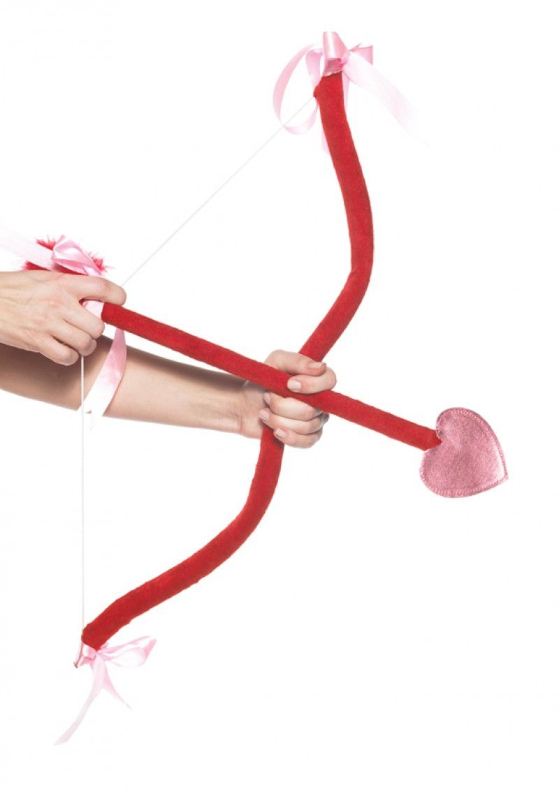 Красный комплект амура включает в себя красный лук, украшенный розовыми атласными бантиками, стрелу с наконечником в виде сердца и красные крылья из перьев. Такой комплект подойдет для празднования 14 февраля и подобных праздников.