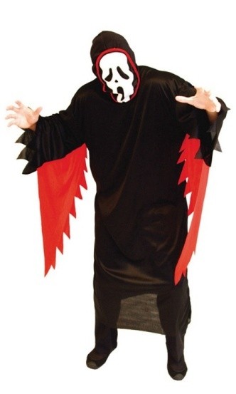 Костюм зловещего Крика перевоплотит Вас в одного из самых популярных персонажей фильмов ужасов. В комплект входит длинная черная роба с красными рваными вставками на рукавах и головной убор с рисунком в виде маски Крика.