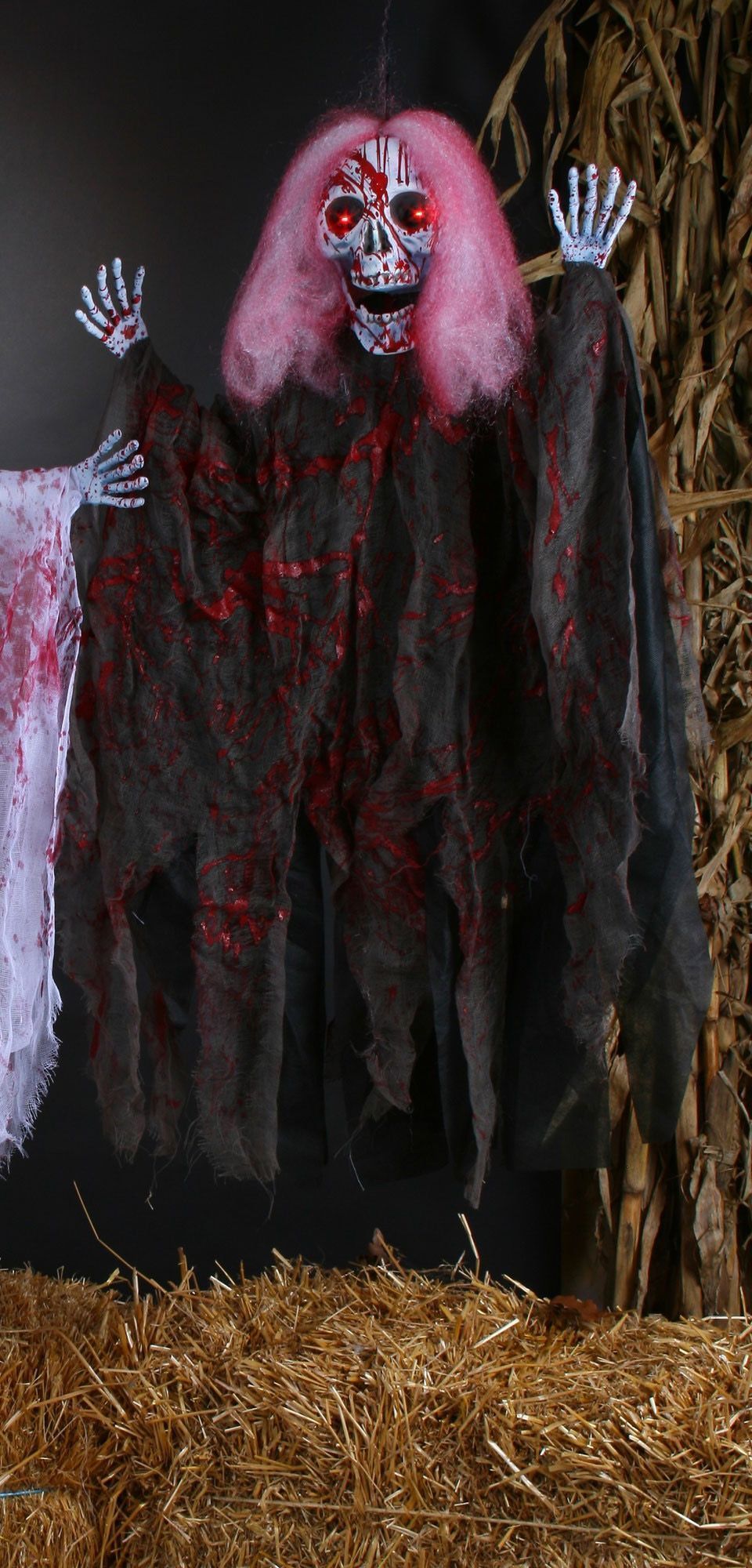 Кровавая Смерть с розовыми волосами - это подвесная фигура Смерти в черном плаще. На всей фигуре имеются кровавые искусственные пятна. С черепа свисают розовые волосы, а глаза светятся красным светом. Повесив такую фигуру у входа, вы сможете отпугнуть "нежеланных" гостей!