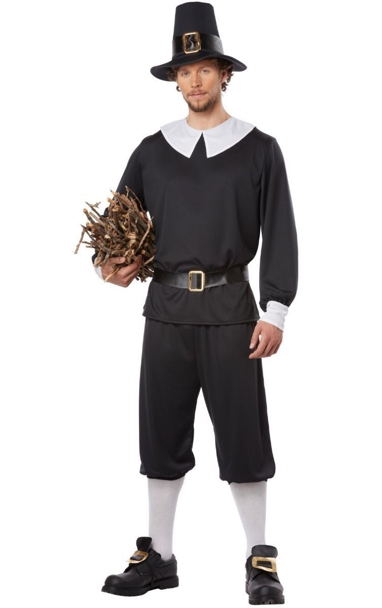 Мужской костюм Пилигрим выполнен в черном цвете и включает в себя рубашку с белым воротничком и манжетами, короткие брюки, пояс с пряжкой, а также высокую черную шляпу, которая украшена ремешком с пряжкой.