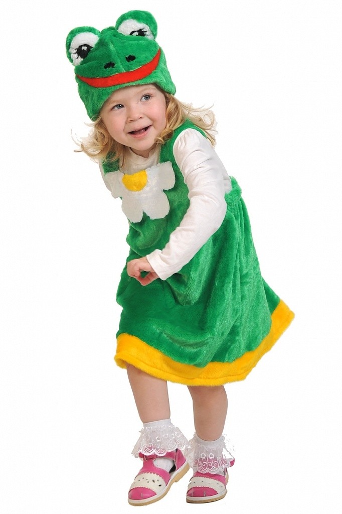 Плюшевый костюм Лягушки выполнен в насыщенном зеленом цвете из мягкого плюшевого материала. В комплект входит платье зеленого цвета с желтым подолом, а также шапочка-маска с объемными глазами.