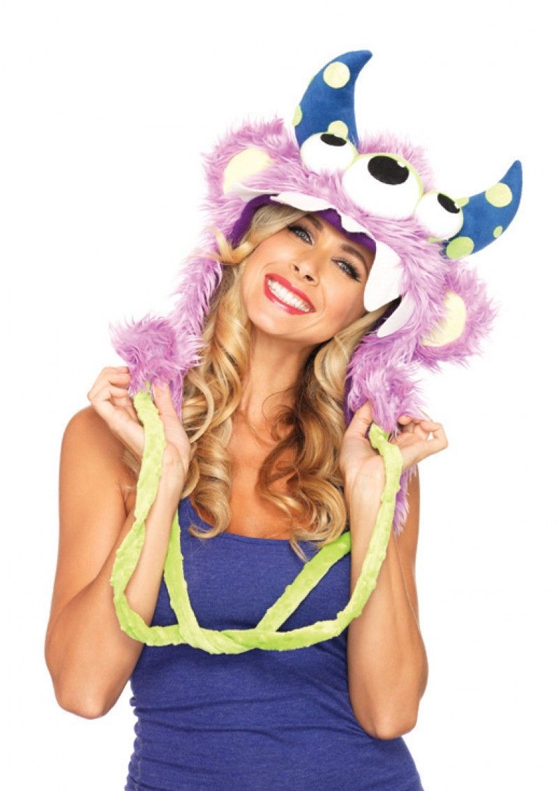 Капюшон Лиловый монстрик представляет собой пушистый капюшон лилового цвета в виде мордочки трехглазого монстрика с клыками и синими рожками. От капюшона тянутся зеленые веревочки с лиловыми помпонами.