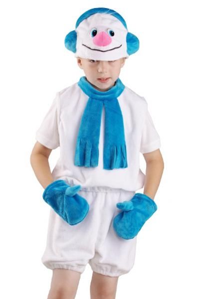 Костюм новогоднего персонажа во всей красе. Красный нос снеговика на забавной маске-шапочке, снежно белый, как положено комбинезон с пуговицами синего цвета в виде помпонов. Помощник деда мороза готов.