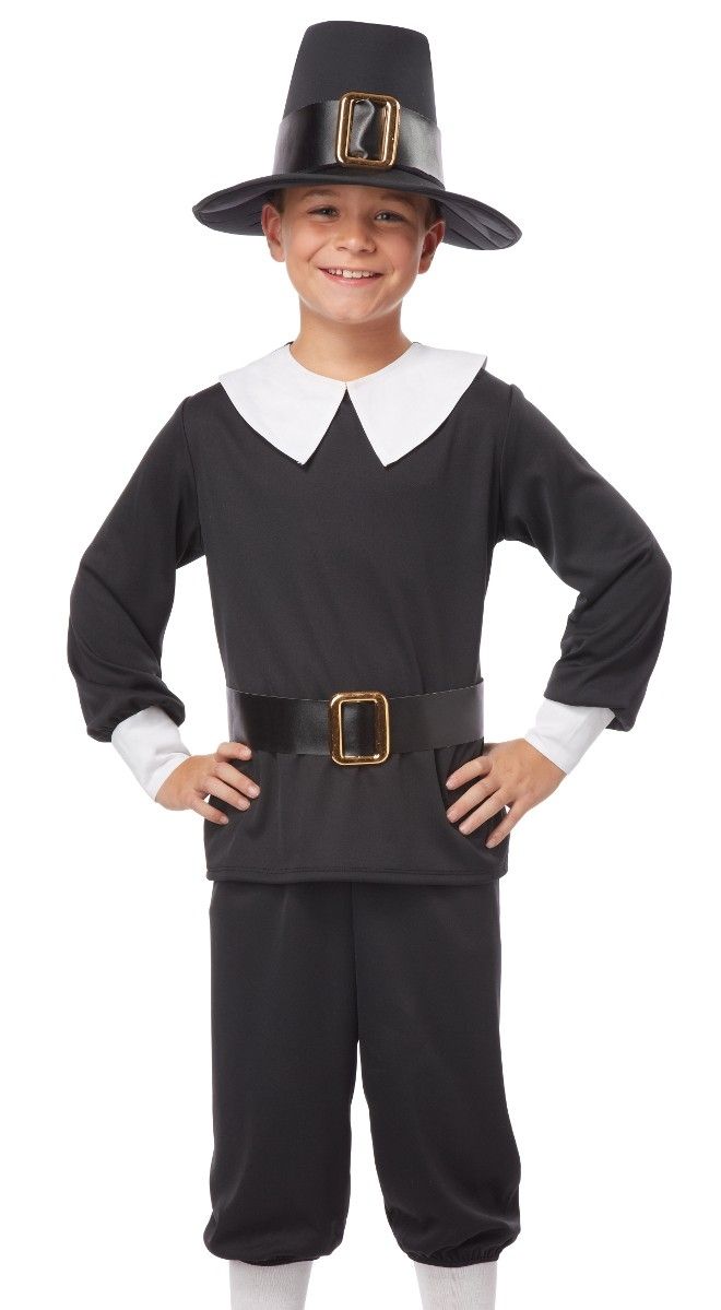 Костюм мальчика пилигрима включает в себя черную рубашку с белым воротничком и белыми манжетами, укороченные брюки, пояс с пряжкой, а также высокую шляпу с круглыми полями и пряжкой.