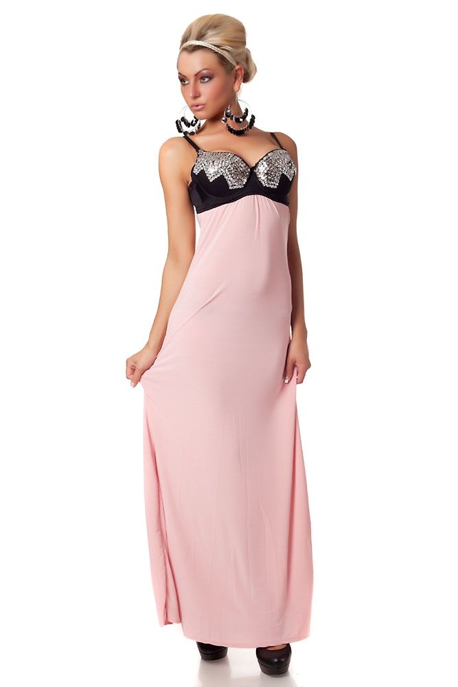 Элегантное розовое платье - это длинное свободное платье светло-розового цвета, верхняя небольшая часть платья выполнена в черном цвете и украшена серебряными стразами. Платье застегивается сзади, также сзади имеется небольшой вырез.